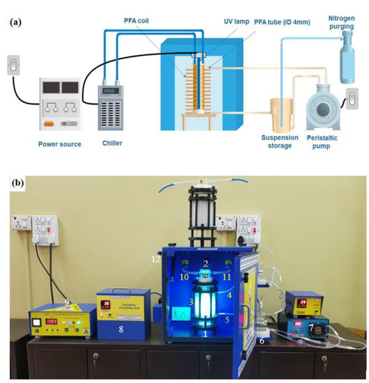 (a) Schematic diagram and (b) experimental set-up of UV coiled tube reactor: (1) UV reaction cell, (2) UV lamp, (3) coiled PFA tube (ID: 4 mm), (4) inlet emulsion to the UV reaction cell, (5) outlet emulsion from the UV reaction cell, (6) circulation storage tank, (7) peristaltic pump, (8) chiller, (9) power supply, (10) inlet cold water, (11) outlet hot water and (12) UV protecting box. The coiled tube UV reactor system is manufactured by Lelesil Innovative Systems Ltd., Thane, Maharashtra, India.