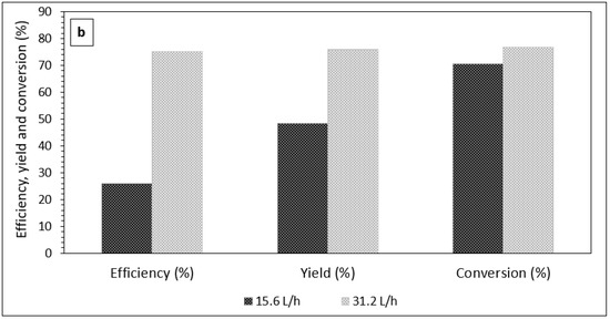 To this end, the effect of two different emulsion volumetric flow rates (15.6 and 31.2 L/h) on the PCM content within the produced microcapsules and process quality parameters, in terms of encapsulation efficiency, product yield and monomer conversion, was investigated, and the result is shown in Figure 4. The mass ratio of PCM to monomers and emulsion circulation time were kept constant at 1:1 and 10 min, respectively. At a higher volumetric flow rate of 31.2 L/h, the PCM content in capsules was 49.53%, whereas it was only 27.12% at the lower volumetric flow rate of 15.6 L/h (Figure 4a). The higher PCM content of the microcapsules was obtained with the higher volumetric flow rate, which creates mixing needed for a better UV exposure. The improvements in other process performance parameters are shown in Figure 4b.
