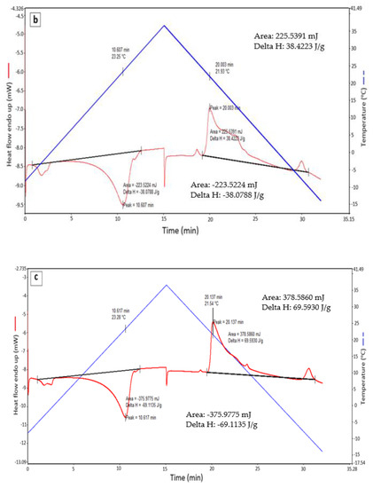 where is the latent heat of microcapsules (J/g) and is the latent heat of bulk PCM (J/g). In Equation (1), it is assumed that the influence of the shell polymeric layer on the latent heat of the incorporated PCM is negligible.