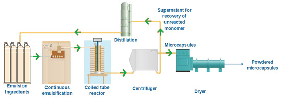 A possible integration scheme of the coiled tube UV reactor into a continuous system for PCM microencapsulation is illustrated in Figure 9. The first step involves the emulsification of components fed in the right proportions and at the appropriate emulsifying conditions. This is followed by the introduction of the emulsified suspension into the UV reactor for polymerization. After polymerization, the wet microcapsule powders are separated from the supernatant by centrifugation. The collected wet PCM microcapsules are then passed through a dryer to obtain dried microcapsules, while the supernatant may undergo a distillation process to recover the unreacted monomers.
