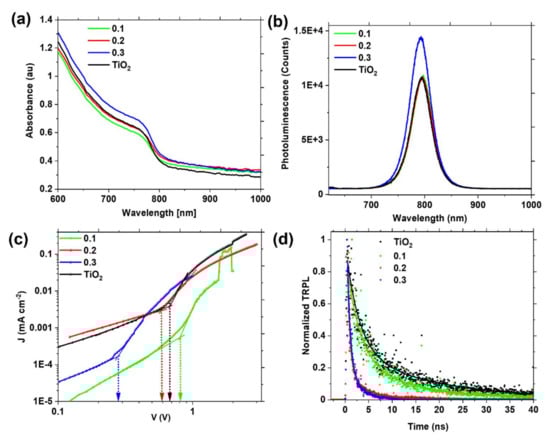 - Yu, M.; Guo, Y.; Yuan, S.; Zhao, J.S.; Qin, Y.; Ai, X.C. The influence of the electron transport layer on charge dynamics and trap-state properties in planar perovskite solar cells. RSC Adv. 2020, 10, 12347–12353. [Google Scholar] [CrossRef]