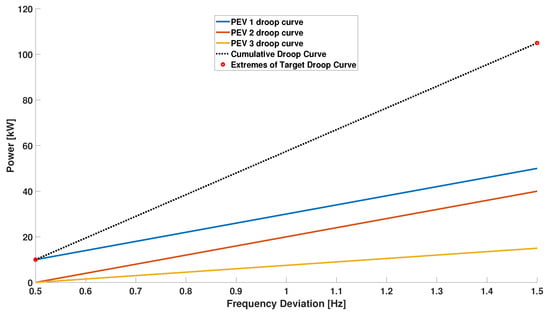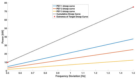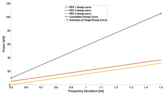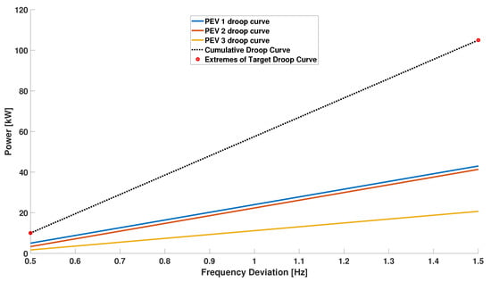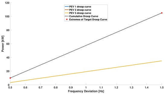 Typically, in smart charging, different charging power set-points are assigned to each charging session. As explained, this leads to different power margins, i.e., different levels of maximum contribution that could be provided by each PEV. This unbalance is considered by the proposed algorithm during the composition of the local droop curves. This is shown in the next simulation, which assumes three charging sessions characterized by different power margins, as summarized in