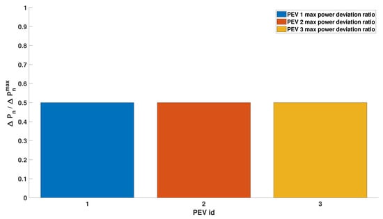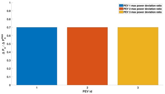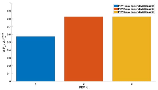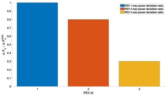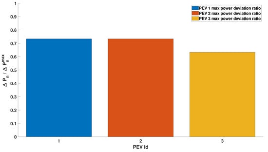 PEV 1 is characterized by the greater SOC error, followed by PEV 2. The algorithm recognizes this condition and prioritizes the assignment of power to these two vehicles. The prioritization is in turn weighted by the respective SOC error.