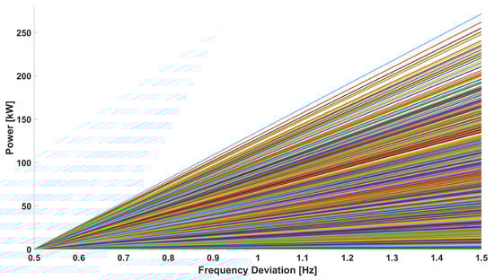 Figure 14 reports the result of local droop curves computation in a scenario with 1000 PEVs participating in the frequency regulation. This simulation does not consider a specific charging technology, the maximum charging and discharging power rates for a generic charging session are randomly chosen, respectively, between 0 kW and 150 kW, and −150 kW and 0 kW. Additionally, the user preferences are assigned randomly. The simulation shows how the proposed algorithm assigns different droop curves considering the current load area requirements (70% of the maximum available aggregated power margin), and the charging sessions status (the result is a uniform distribution of droop curves with no particular clustering). As already mentioned, being the problem linear with continuous variables, very low computational time was observed in various experiments, always between 1 and 1.3 s.