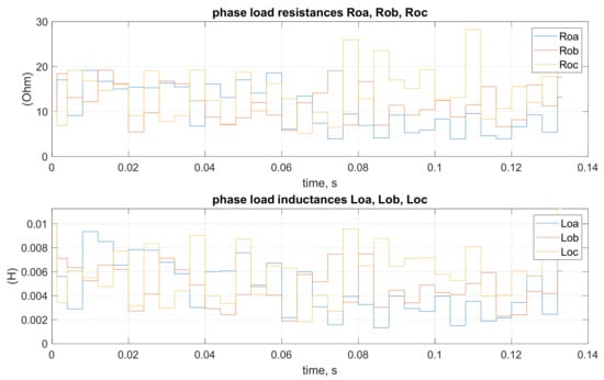 The obtained equations simulate the examined system in Figure 1. By applying this implicit method of discretization (21), it is possible to avoid instability in numerical solutions. The unknown, random variable load of the system is modeled by applying random changes in resistances Ra, Rb, Rc and inductances La, Lb, Lc in time.