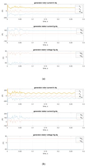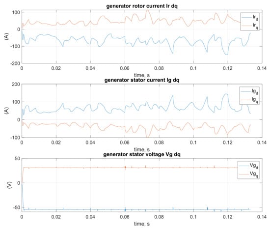 The optimization method with square cost functions (23) and (46) confirmed its usefulness in the control of a rotor-side converter of a DFIG generator of a wind farm. The main goal was to obtain a three-phase symmetrical voltage with the minimal higher harmonic content for receivers in an islanded grid. The difficulty in gaining such a high-quality voltage is connected to an uneven load on each phase. Additionally, the load of each phase of an islanded grid changes randomly. The cost function is determined by the given matrices Q and R in the cost function (46). The relationship between these matrices is established by etaR and eta1 coefficients from Equations (47) and (48). These coefficients determine the effect of an increase in the control value and the voltage error on the control process. The decay rate of the transients of the state variables is also important. The oscillation in the rotor current in dq coordinates was observed. Successful attempts were made to control these states. In the cost function, the shares of the islanded grid voltage quality, the value of control variables and the decay rate of state variable oscillations have to be balanced. The results are presented in Figure 30. The load in these simulations is variable in nature in the time range up to 0.05 s. After this time, the load is constant. It can be seen how the oscillations of the rotor current , generator current and generator voltage decay.