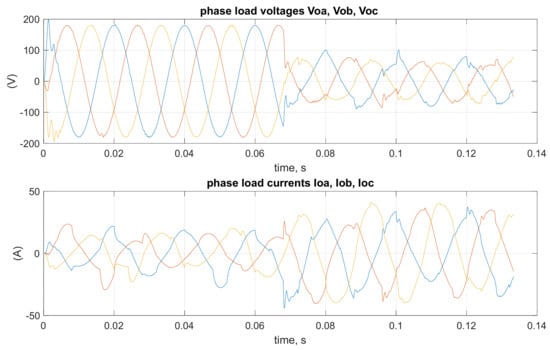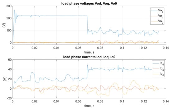 To the set of equations passed into the function solve (), only the first two equations from (9) concerning d and q coordinates are taken, forming Equations (5) and (6). Equations (7)–(9) are load voltage equations. These equations in phase coordinates are expressed as follows: