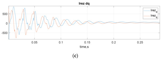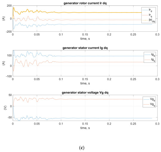 Dq coordinates of rotor current , stator current and stator voltage of DFIG generator: (a) type a protection is applied; (b) type b protection is applied; (c) type c protection is applied.