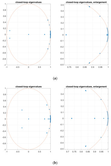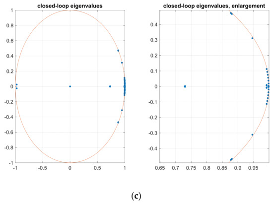 Distribution of eigenvalues for the closed loop system: (a) type a protection is applied; (b) type b protection is applied; (c) type c protection is applied.