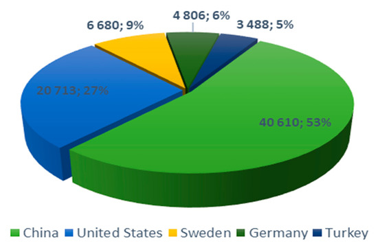 Considering the largest installed capacity, the top five countries using geothermal energy directly are: China, the USA, Sweden, Germany and Turkey, which together account for 71.1% of world capacity (Figure 2). Top countries with the highest annual geothermal energy consumption are China, the USA, Sweden, Turkey and Japan, respectively, accounting for 73.4% of annual consumption worldwide [34].