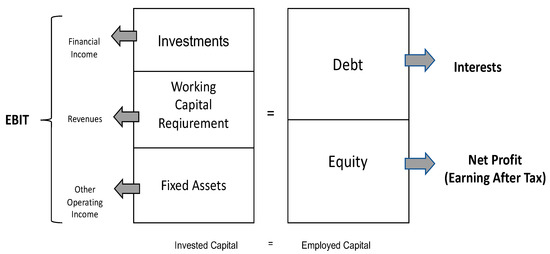 The creation of flows from assets is equated with FCFF (free cash flow to firm), which is based on the determination of Earnings Before Interests and Taxes EBIT, operational performance, which is then adjusted by flows from investing activities relating to fixed assets, as well as from operating activities relating to net working capital requirements. Thus, a link is made between the accrual recognition of the ability to create financial result from EBIT assets and its cash equivalent identified with FCFF [49].