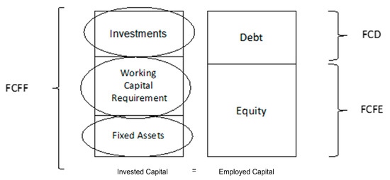 Linking decision-making areas to cash flow. Source: Own study on the basis of: [50]. Legend: FCFF—Free Cash Flow to Firm; FCFE—Free Cash Flow to Equity; FCD—Free Cash Flow to Debt.