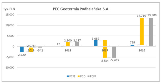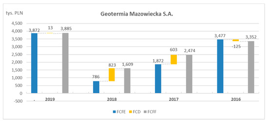 However, examining the cumulative FCFE in the analysed period 2016–2019, it can be seen that the highest value is shown by Geotermia Mazowiecka S.A., with PLN 10,005 thousand.