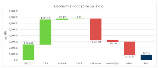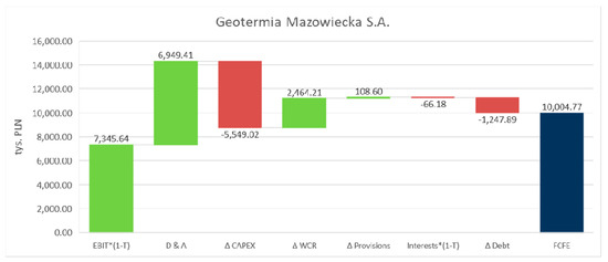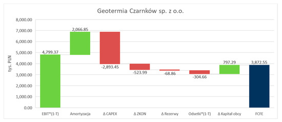 When it comes to assets’ ability to generate cash, Geotermia Mazowiecka S.A. shows the highest cumulative value in the analysis period (over PLN 11,318 thousand). The same entity can also boast the highest level of cash flow for FCFE owners (over PLN 10,005 thousand); this meant that Geotermia Mazowiecka had the highest potential to generate cash (Figure 12).