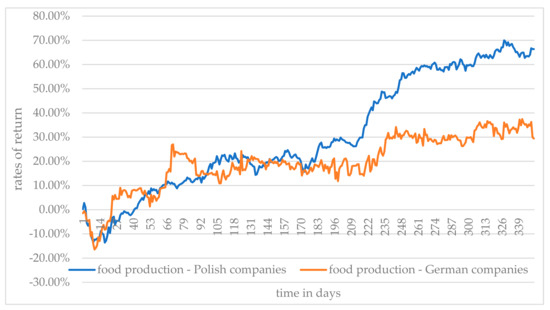 - after more than 3 weeks of decreases in abnormal rates of return for companies from the food production sector in the following period marked increases were observed both in the case of Polish and German companies, with the increases being greater in the case of Polish companies,
