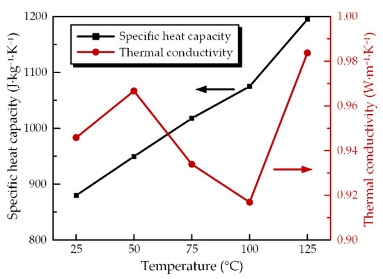 The thermal conductivity, specific heat capacity and density of the epoxy insulator vary with different manufacturers and types; thus, these parameters were measured respectively. The density was 2300 kg·m−3 at 20 °C and it varied slightly with the temperature. Since the thermal conductivity and specific heat capacity varied with the temperature, the parameters at different temperatures were measured by the transient hot-wire method for thermal conductivity (XIATECH, TC3200) and the DSC method for specific heat capacity (NETZSCH, DSC 200F3). The results are shown in Figure 2.