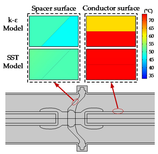 Although the k-ε turbulence model is widely used in the analysis of turbulent flow due to its robustness, the accuracy at the near-wall region is a noteworthy disadvantage that would lead to discontinuous temperature distribution at the gas–spacer interface in this case. Satisfactory temperature distribution cannot be expected via this model. Thus, the SST turbulence model, especially for the low Reynolds number condition, was applied which can be attributed to the superior behavior at the near-wall region [10,18]. COMSOL Multiphysics software was applied to conduct the simulations. The difference in temperature distribution at the interface via the k-ε model and SST model is shown in Figure 3.