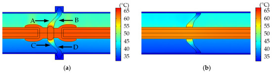 Temperature distribution with different geometry models. (a) represents the result of the real-type model, and (b) represents the result of the simplified model.
