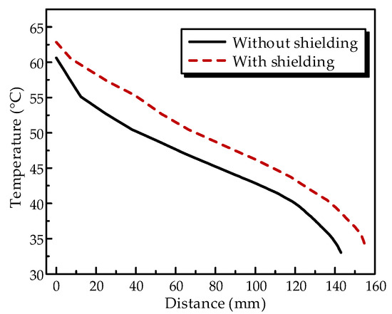 As shown in the figure, the removed components affected the temperature distribution. A lower temperature was obtained in the simplified model compared with the real-type model. A higher temperature region was obtained near the shielding at both sides of the spacer due to the considerable heat generation. The temperature distribution along the convex surface of the upper part (Curve A) as marked by an arrow in Figure 4 was obtained and is shown in Figure 5 for both models. In this figure, the x-axis value indicates the distance from the conductor–spacer intersection along the spacer surface. The value 0 was in accordance with the point at the intersection and the distance increased from the conductor to the enclosure.