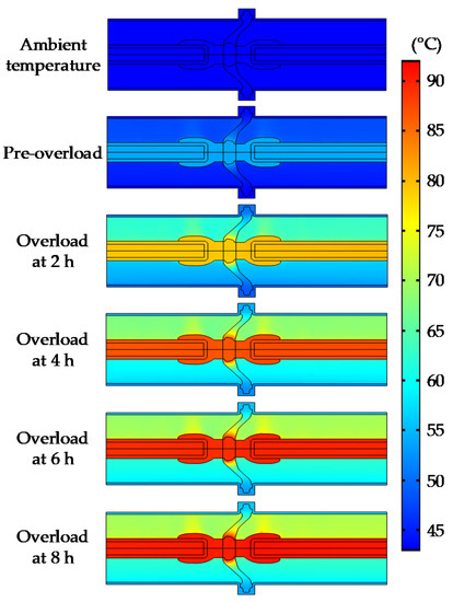 To evaluate the thermal performance under overload conditions, the process leading to the temperature rise in the spacer and the GIL model was investigated. According to the standard [1], the ambient temperature was fixed at 40 °C, and a pre-overload current with 50% of the rated continuous current was applied for a given time interval to form the pre-overload thermal gradient. Then, an overload current 10% higher than the rated current was applied and the process leading to the temperature rise under overload conditions was obtained. In this case, the rated continuous current was 3150 A and the pressure of SF6 gas was 0.5 MPa. The maximum temperature in the GIL with heating time is illustrated in Figure 14. This point corresponding to the maximum temperature was at the spacer–conductor intersection.