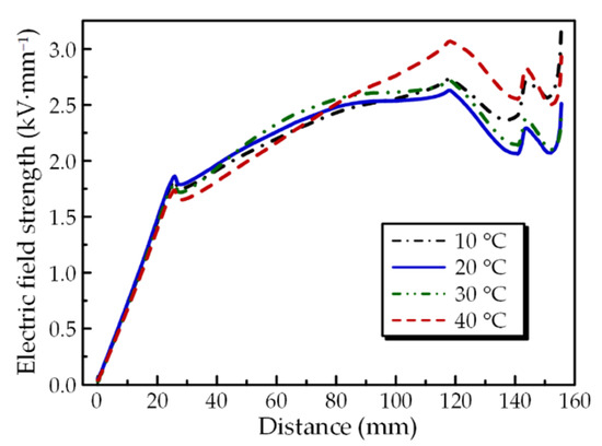 To analyze the influence of ambient temperature referring to the thermal gradient on the field distribution, the electric field distribution of the spacer under different ambient temperature was obtained. The corresponding condition and thermal gradient applied to the temperature-dependent electric conductivity were in accordance with Section 3.4. Thus, the ambient temperature was 10, 20, 30 and 40 °C. The current was 3150 A and the gas pressure was 0.5 MPa. The field distribution along curve A is illustrated in Figure 17.