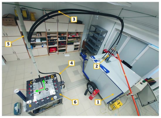 The view of the measurement system before the first operation: 1—impulse current generator, 2—high voltage output, 3—high-voltage cable, 4—return wire, 5—insulated ceiling holder, 6—test bench.