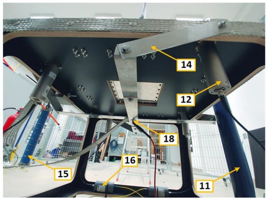 The bottom view of the test bench: 11—high-voltage divider, 12—current shunt, 14—aluminum bar, 15—pulse forming part, 16—fiber optic system transmitter, 18—connection point.