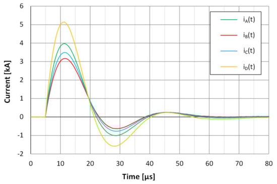 Figure 4 shows the current distribution in the aluminum plate during functional testing of the first design solution, especially concerning the return circuit with the asymmetrical tape arrangement (part 13 on Figure 1 and Figure 2), which manifested itself in a significant variation in the peak values of the observed currents. In this case, a 10 kV charge voltage of the surge generator was applied and a peak current of about 4.8 kA was obtained at the HV output. The level of current value iB(t) was not sufficient to exceed the measurement system trigger threshold. The shapes of the other currents were close together. They differed in rise times from 0 to the maximum value. The shortest (equal to 7 µs) was observed for iD(t) and the longest (8 µs) for iC(t). The maximum values for currents iD(t), iA(t), and iC(t) were as follows: 2.55, 1.6, and 0.63 kA.