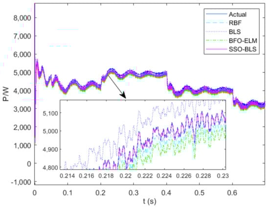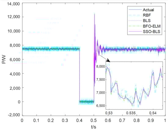 The internal operation conditions of DC microgrids are complex, and the load changes are diverse. In order to verify the generalization performance of the model and test the reliability of the model, the established model is applied to three different load conditions, and the results are shown in Figure 7, Figure 8 and Figure 9. Figure 7 describes the situation that the internal loads of the microgrids are reduced by 15%. The DC microgrids can output more power to the AC grids, which shows the fitting effects of different algorithm models under this working condition. Figure 8 describes that with a 15% increase in the internal load of the microgrid, the DC microgrid consumes more electric energy and the power output to the AC microgrid decreases, which shows the fitting effect of different algorithm models under this working condition. Figure 9 shows that the internal load of DC microgrids increases by 50%, the electric energy generated in the DC microgrids can not meet the load requirements. It is necessary to absorb part of the electric energy of the AC grids to maintain the balance between power supply and load and shows the fitting effects of different algorithm models under this working condition. Figure 10 shows the comparative analysis of the model fitting results established by different algorithms when the power of the photovoltaic power plant fluctuates. As can be seen from Figure 7, Figure 8, Figure 9 and Figure 10, the equivalent model based on the SSO-BLS algorithm can still well fit the operation state of microgrids under different conditions. The verification results show that the model established by the SSO-BLS algorithm has a good generalization ability and high precision, which can provide an effective guarantee for the equivalent modeling of the grid-connected DC microgrid.
