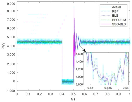 The fitting results of SSO-BLS under the condition of single-phase grounding short circuit fault in the AC distribution network are shown in Figure 3; The fitting results of SSO-BLS under the condition of two-phase short circuit fault in AC distribution network are shown in Figure 4; The fitting results of SSO-BLS under the condition of three-phase short circuit fault are shown in Figure 5. At the same time, the fitting results of BLS, BFO-ELM, RBF, and SSO-BLS are compared and analyzed.