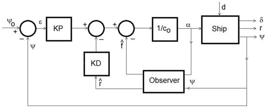 The following symbols are used: ψ—heading angle, ε—error signal, α—steering gear command, δ—rudder deflection angle, r—angular speed and d—disturbances.