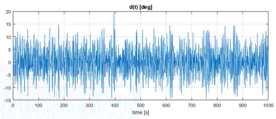 During the last test, a white noise generator with the sampling time and power parameter set as 0.5 s and 0.0001, respectively, was connected to a band-pass filter, described by the following transfer function [