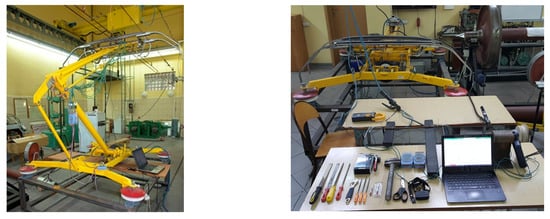 The test stand (Figure 1) represents a power supply system with one profiled contact wire—Cu-ETP (type according to EN 50149:2012, 100 mm2), made of copper of Cu-ETP grade together with carbon strips. In the electrical circuit of power supply–contact wire, contact strip–power supply, 200 A current flowed. The value for the current was measured using a Lutron CM-9930 clamp meter.