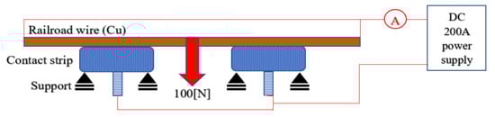 The contact strips pressed the contact wire with a force of 102 N. Thermocouples were placed on the contact wire above the contact strips, as shown in Figure 2.