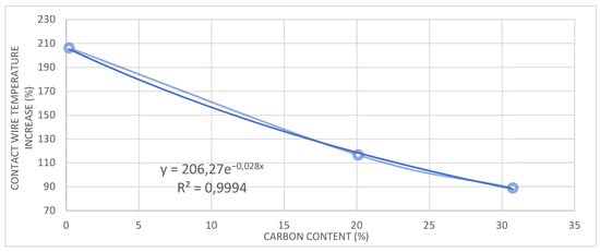 where: ΔTCu °C—increase in the contact wire temperature; C %—the concentration of copper in the composite material.