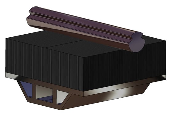 The contact strip axles are 295 mm apart. The contact wire has a length of 1000 mm. The FEM model reproduces half of the system shown in Figure 5, i.e., one contact strip with an active length of 875 mm and a contact wire with a total length of 500 mm (division: 147.5 mm/352.5 mm). The contact surface of the contact wire with the contact strip has a width of 1.6 mm and is A = 1.6 × 61 = 97.6 mm2. Due to the need to perform numerous calculations and the purpose of the study, the FEM model did not model the full contact of the wire with the strip, but the contact surface was shared and this surface was thermally loaded. The CAD model was exported to the FEM program, but only the geometry of the contact strip cross-section and the contact wire Cu-ETP (with a cross-sectional area of 100 mm2) with geometry according to Iet-4 were used in this program. This allows for the reduction of possible modeling and importing errors in CAD/FEM programs; see Figure 6.