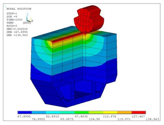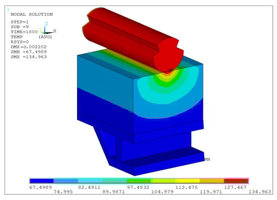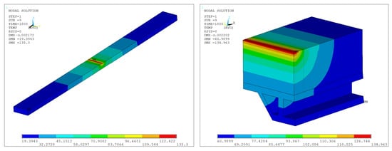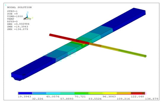 The FEM model contains elements with a nonlinear shape function with the possibility of carrying out coupled field (thermal–mechanical–electrical) calculations, but only the results of temperature distribution and total relative displacements were used in this study. The figure below (Figure 7) presents examples of temperature distributions of the sliding strip–contact wire system, and Figure 8, Figure 9, Figure 10, Figure 11 and Figure 12 shows the temperature distribution in cross section of this system, for variant BIII (designation according to Table 3).