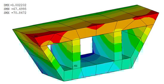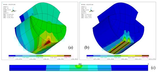 A nonlinear elements type hexahedral with 20 nodes was used for the FEM model. This type of finite element allows for a coupled field with mechanical–thermal–electrical domain calculations. After repeated grid optimization, the model geometry was mapped using 2348 finite elements; see Figure 6.