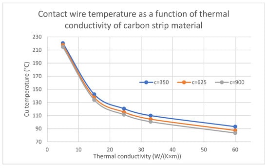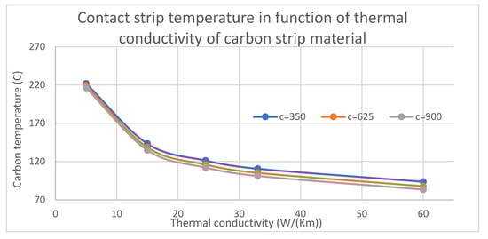 Contact wire temperature as a function of thermal conductivity of the carbon strip material for specific heat.