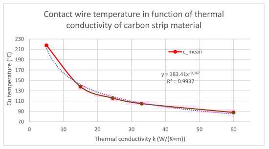 The correlation between the value of the thermal conductivity k (W/(m × K)) of the contact strip and the contact wire heating temperature was calculated from the relationship: