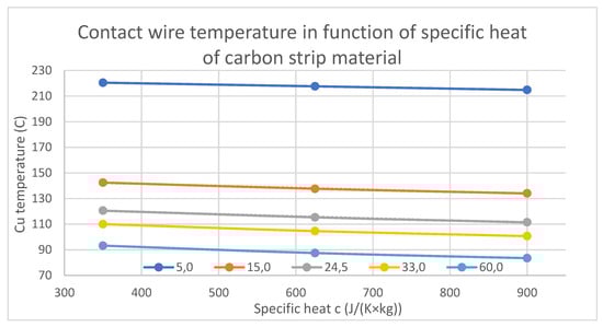 In order to determine the minimum value of thermal conductivity and specific heat of the sliding strip material and their combination, 15 simulations were performed, i.e., using 5 different thermal conductivity values and 3 specific heat values. This test also allowed us to analyze the sensitivity of these coefficients to contact wire heating based on changes in their values.