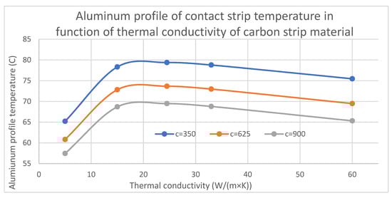The course of changes of contact strip temperature depending on thermal conductivity is shown in Figure 16.