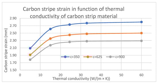 Figure 18 shows that after exceeding the value of the coefficient k > 20 W/(Km), the relative deformations caused by the thermal stress of the contact strip are at a constant level, i.e., about 2.3–2.8 mm, depending on the specific heat value of the contact strip material.