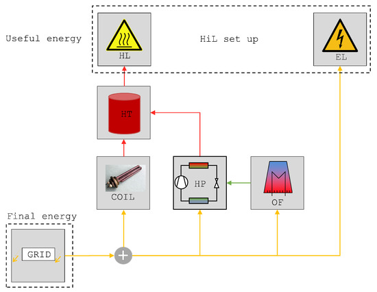 Block flow diagram of the heat pump-based building energy system. HP (heat pump), COIL (heating coil), HiL (hardware in the loop), HT (hot tank), HL (heating load), EL (electrical load), OF (outdoor fan).