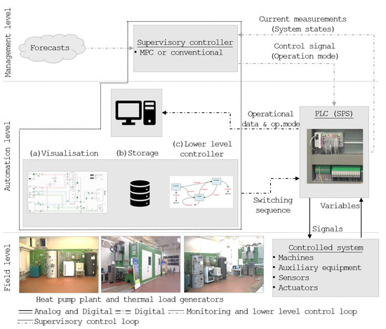 The data acquisition and control was implemented within a standard industrial BAC framework, as shown in Figure 2. Here, the supervisory controller on the management level can use either MPC or a conventional rule-based controller (for comparison purposes) to switch on the HP and/or the COIL either in parallel or alternatively. Forecasts for weather conditions and loads required by the MPC are retrieved automatically from local or remote services and databases. The management-level controller is programmed in Python and sends its control signal to the PLC (OPC server) on the automation level. A local machine (desktop computer) interacts with this server for the storing and visualization of monitoring data. Additionally, the local machine also runs a state-machine-based lower-level controller that uses the control signal (plant state) value in its sequential control logic to perform the state-based actions and transition tasks; e.g., valve sequencing or switching pumps for that particular state. The data flow represented by dash-dotted arrows uses only digital signals and standards necessary for OPC, API, and SQL communication, whereas solid arrows use both digital and analog signals; e.g., resistance and voltage and the M-Bus communication protocol. Additionally, the grey lines are part of the control loop that repeats once every control horizon, and black lines are part of the monitoring loop that repeats continuously every 300 ms.