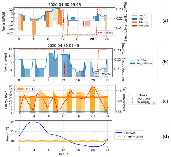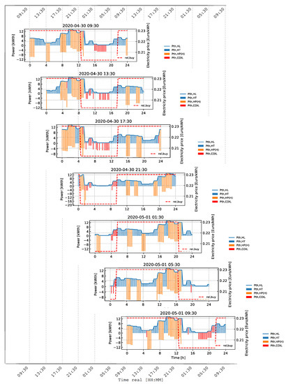 As an example of the receding horizon scheme, multiple MPC iterations during a 24 h experiment with the same parameters as in Table 1 were collected. The thermal balance for an iteration after every 4 h is illustrated as a subplot in Figure 4. As the forecast horizon recedes or shifts, the heating load forecast and electricity price for the next 24 h are updated and a new optimal schedule is calculated. For instance, in the second subplot (2020-04-30 13:30) the between Time = 0 h to 4 h is different compared to the solution in the first subplot (2020-04-30 09:30). Thus, the actual solution applied on the plant was more adjusted to the current situation of the plant and the grid. Additionally, the forecasted operation of the COIL also differed in all the subplots due to the update of the forecast data.