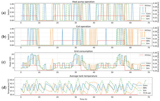 The forbidden runtime controller and MPC were each tested for ca. 68 h, and the FTL conventional controller was simulated for the same time. All controllers started with similar initial tank temperatures. To understand the fundamental differences in the actions of the controllers, the switching sequences and electrical balance along with the electricity price are plotted in Figure 5a–c. Additionally, as an example of the physical constraints, the average tank temperature for the three controllers is plotted in Figure 5d. The results of the test with a conventional forbidden runtime controller are plotted in blue (Conv), with MPC in orange (MPC), and with the simulated FTL controller in green (Sim). The significant observations are summarized below.