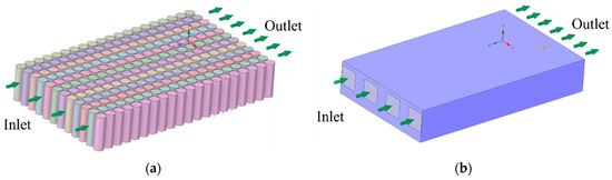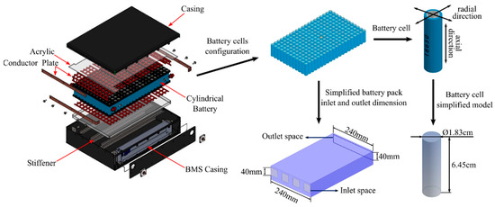 The original geometry of the battery pack was complex, so it was difficult to configure the airflow within the battery pack iteratively with the Ansys Discovery Live software. This situation could also lead to continuous errors and long simulation time. To achieve the optimum results using the software, the battery pack was modeled as a simplified form without removing the components sensitive to the heat generation within the battery pack. The battery cells themselves consisted of layers of cathode, anode, separator, and current collector. Although these different layers had their thermal properties, the detailed structure of the cylindrical cell presented in Figure 1 had an insignificant impact on the thermal performance of the battery, according to many references [35,36]. Therefore, the battery parameters listed in Table 1 were utilized as the equivalent values representing a whole battery cell.