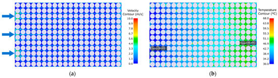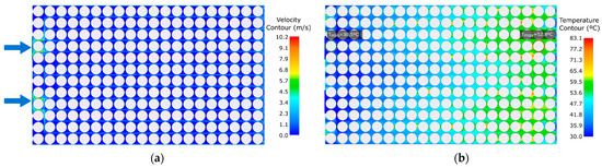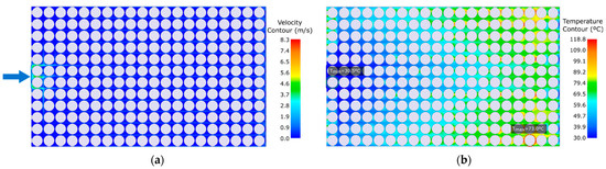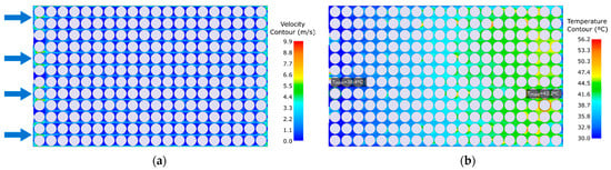 The air entered the battery pack through the inlet on the left side and exited through the outlet on the right side while taking the heat generated by the batteries in the process. The arrows on the left side of the figure indicate the number and locations of the inlet and the airflow direction. The air velocity had its maximum value around the inlet as the nearest area to the cooling fan. It gradually decreased as it reached the outlet due to the decreasing kinetic energy. On the contrary, the battery temperature was at the minimum value around the inlet and gradually increased as it got further. This happened because the convective heat transfer decreased due to the rising temperature of the air as it traveled through the battery pack while taking the heat from the batteries. This phenomenon led to the temperature difference that resulted in different charging/discharging rates between battery cells, causing a heavy workload for BMS. Excessive workload caused inefficient equalization, especially for BMS with an active balancing method, leading to non-optimal power generation and reducing the batteries’ lifespan faster. Ideally, the simulation result needs to be validated with an experiment, but obtaining velocity and temperature contour from an experiment might be challenging. However, the current simulation result was sufficient to show the temperature distribution, which represents the performance from each configuration.