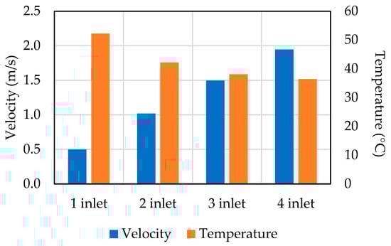 The overall velocity and temperature results were represented by their average value. The average value of air velocity and batteries temperature from each configuration are plotted in Figure 7. The results generated showed that air velocity increased while the temperature decreased with the increasing number of inlets. The increase in the number of inlets meant an increase in the number of cooling fans. This led to more power pushing the air from the inlet to the outlet, resulting in higher air velocity and more air particles transferring the heat from the batteries. This condition, in turn, caused a lower temperature as the number of inlets increased. The lowest average temperature of 36.4 °C was achieved by the four inlets configuration; however, the maximum battery temperature was still 42.2 °C, which is higher than the maximum optimal temperature range of 40 °C. Therefore, an additional optimization strategy was needed for the air-cooled BTMS to meet the optimal temperature requirement. In the next section, we varied the inlet air temperature and the number of inlets to obtain the optimum cooling strategy.